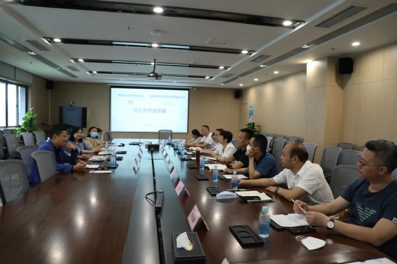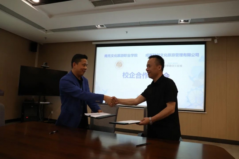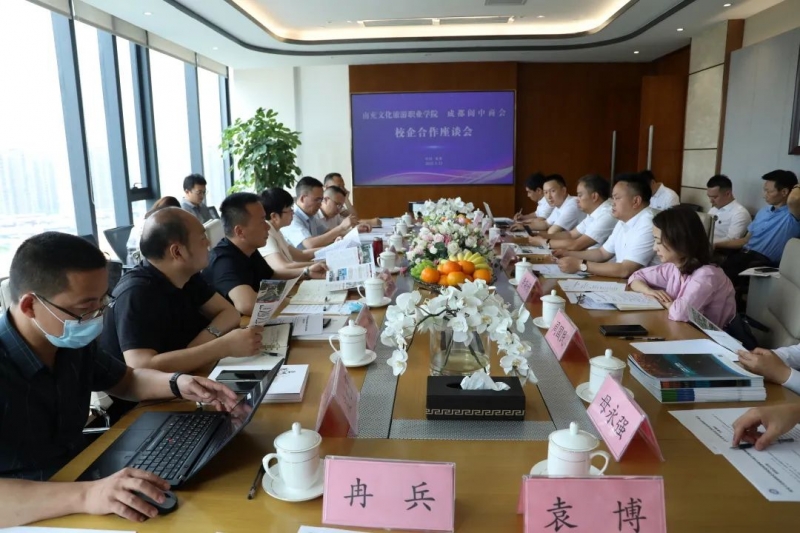 在成都融创文化旅游管理有限公司,该公司副总经理赵亚明、师云刚等热情接待了王荣秀一行,并进行了座谈。座谈会上,双方就人才培养需求、学生实习岗位、校企深度合作等方面进行交流,并签订《战略合作框架协议》。