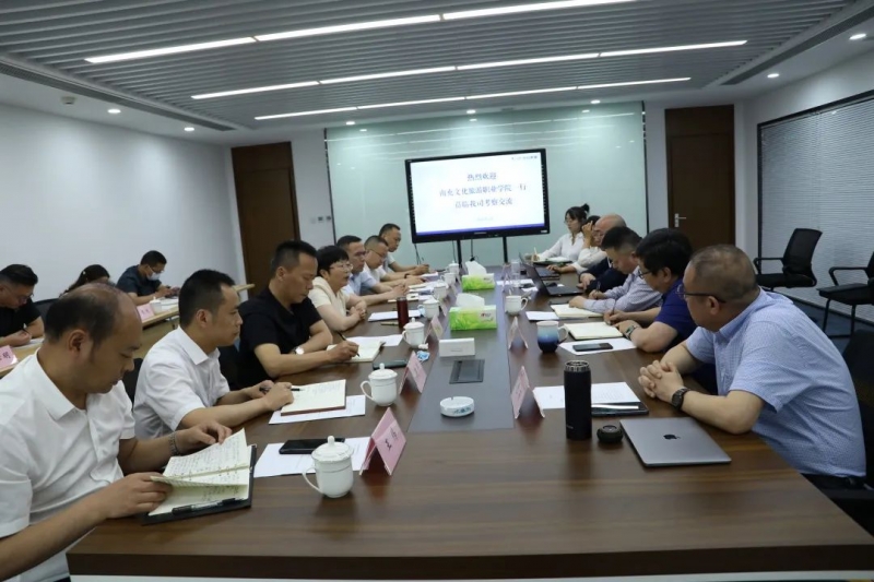 在四川旅投教育投资有限责任公司,该公司党委书记、董事长任明德等热情接待了王荣秀一行并进行了座谈。会议由旅投教育公司党委副书记、董事、总经理赵禹主持。座谈会上观看了四川旅投宣传片,任明德介绍了旅投集团及旅投教育公司情况。双方就培养跨界领军人才、扎实技能和职业精神的服务人才、数字文旅、数字营销等方面进行了交流。王荣秀感谢旅投教育公司的热情接待,她希望双方深度开展校企合作,搭建协同育人平台,借助旅投企业资源优势助力学院培养文旅人才和大国工匠,引领行业发展。