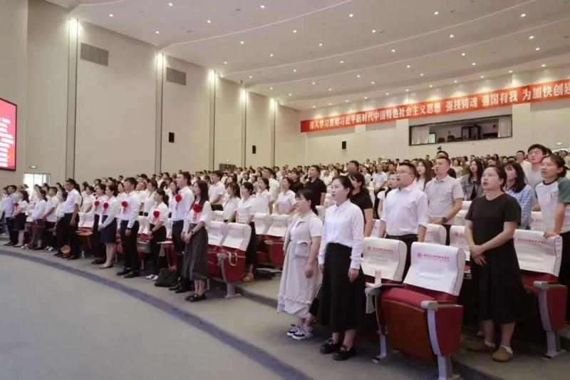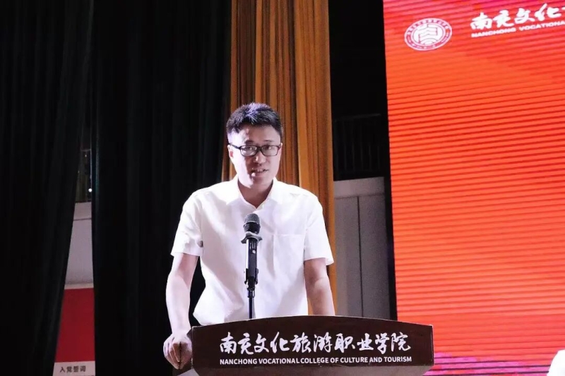 谭斌宣读新入职教职工名单,获南充市表扬的人员名单和学院2024—2025学年度教育教学、科研工作先进个人及先进集体名单。全体新入职教职工面向国旗庄严宣誓。